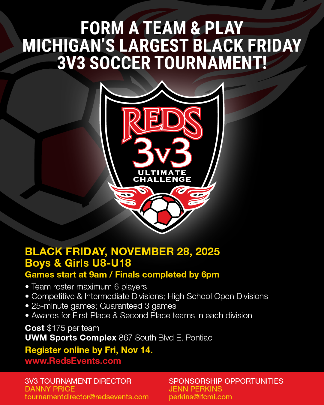 We look forward to hosting 200+ teams at Michigan's largest Black Friday 3v3 Soccer Tournament!